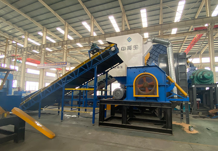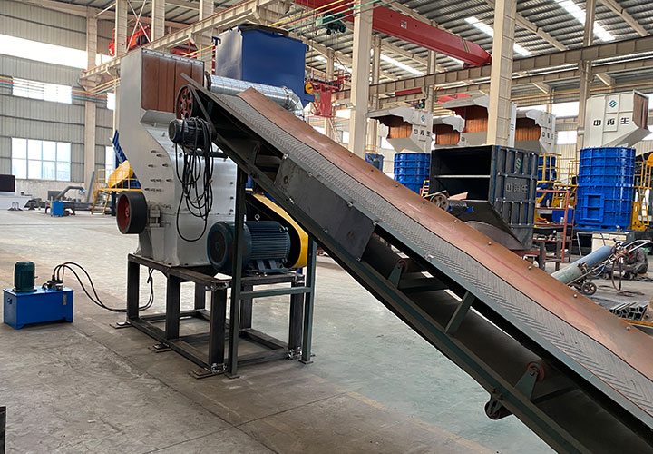 破碎線主機殼體采用特厚鋼板制造,內襯為高錳鑄鋼件,可更換;主機轉子盤安裝于水平軸上,轉子盤圓周分布有銷軸,軸向懸有錘頭;主軸用滾珠軸承支撐,循環油強制潤滑冷卻,并裝有溫度傳感器;進料口裝有液壓輥筒喂料裝置,位置一高一低,同向旋轉,能將大件松散物料壓扁,送入破碎腔內。