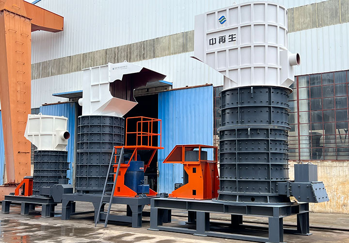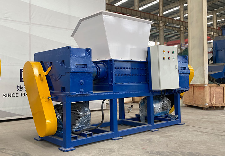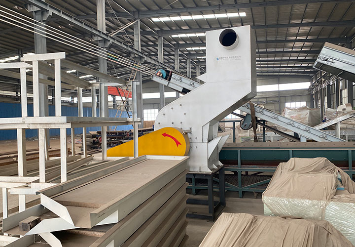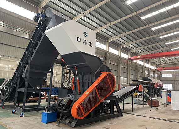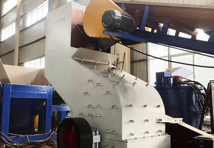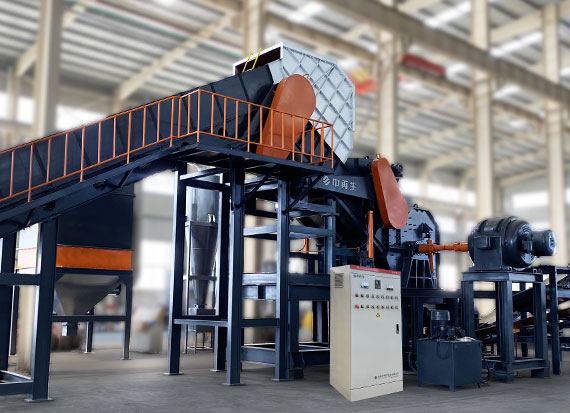 破碎線主機殼體采用特厚鋼板制造,內襯為高錳鑄鋼件,可更換;主機轉子盤安裝于水平軸上,轉子盤圓周分布有銷軸,軸向懸有錘頭;主軸用滾珠軸承支撐,循環油強制潤滑冷卻,并裝有溫度傳感器;進料口裝有液壓輥筒喂料裝置,位置一高一低,同向旋轉,能將大件松散物料壓扁,送入破碎腔內。